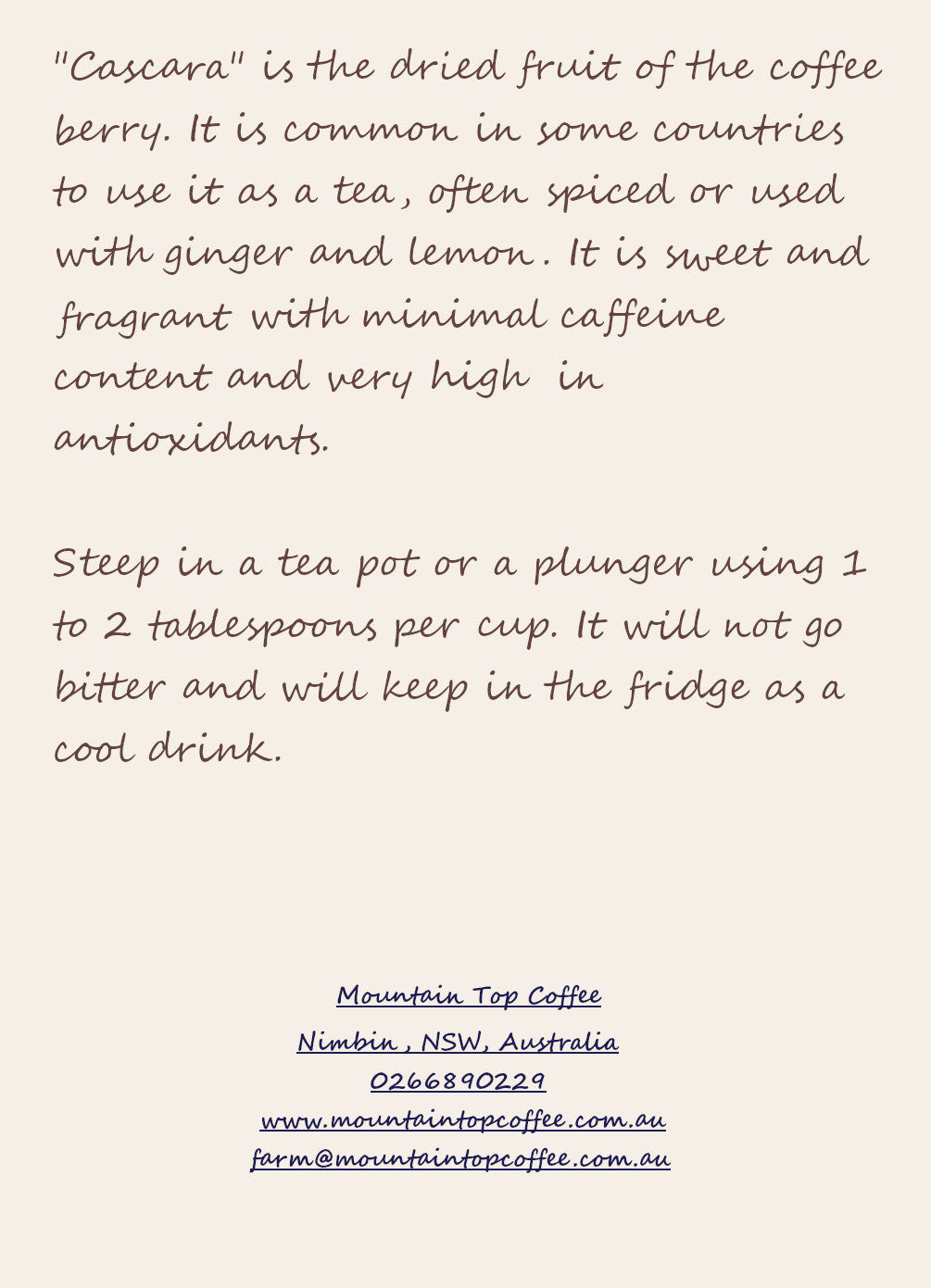 While Cherry Cascara is widely available, Natural Cascara is exclusive to Mountain Top Estate - discover the sweeter taste for yourself!